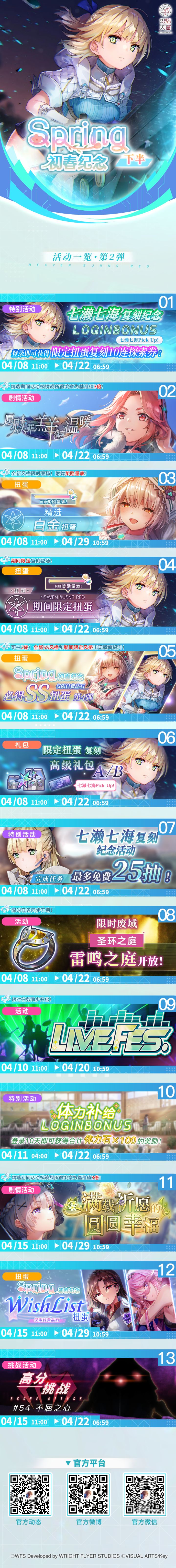 叮咚!初春纪念下半・第2期一览已送达!本次将介绍初春纪念下半版本【第2&3周】的活动内容~(●′ω`●)▶期间限定风格复刻登场!■ 4/8 11:00起,期间限定风格SS<灵魂共鸣>七濑七海[天使危机]即将复刻登场!▶七濑七海复刻纪念活动限时举办!■ 4/8 11:00起,游戏内将开启「七濑七海复刻纪念活动」,参与相应的登录活动和限时任务,最多可获得「限定扭蛋复刻10连探索券×3」、「必