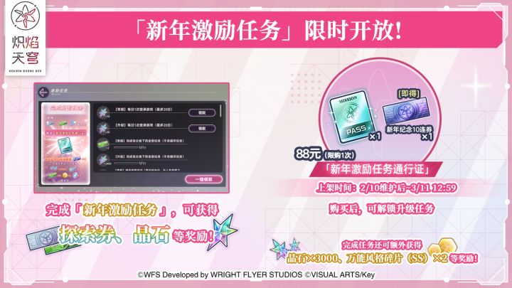 ▶新年激励任务▌活动时间:2026/2/10 维护后 ~ 3/11 12:59▌活动概要:●活动期间登录游戏,推进“阅读剧情”、“完成每日任务”等任务,可以获得晶石、新年纪念探索券、常驻扭蛋探索券等奖励!●新年激励任务分为「常规类任务」及「升级类任务」,两类任务完成条件相同。●「常规类任务」将在更新后直接开放,「升级类任务」需通过购买「新年激励任务通行证」解锁。------------