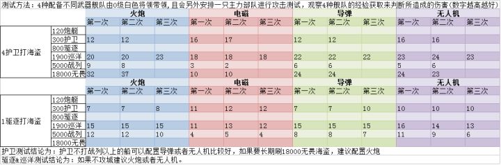 上面是关于武器的选择的测试测试方法:4种配备不同武器舰队由0级白色将领带领,且会另外安排一只主力部队对海盗进行攻击测试,需要测试的4支舰队提前在海盗身边协助作战,观察4种舰队的经验获取来判断所造成的伤害(数字越高越好)测试数据其实已经比较明显了,结论也写在里面了。因为目前我们的主力还是护卫或者巡洋,所以其他的我就没测试了。护卫测试结论为:护卫不打战列以上的船可以配置导弹或者无人机比较好,如果