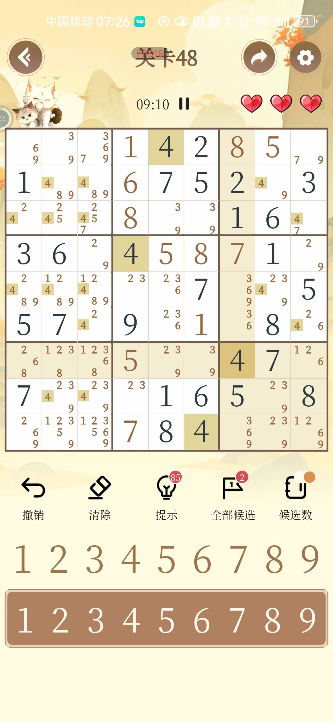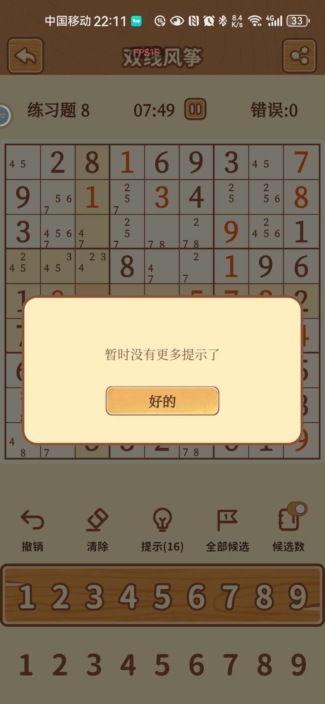 图一在这里按下提示的时候为智能解题。但是其实这里是可以发现有一个长线风筝(图二)。可是长线风筝只能得出r2c3这个格子不能填入4。这时候我用的是一个暂时称为假设法的方法,一般比长线风筝能得出更多有用的信息。方法是假设某一个或多个格子填入该数时其他格子的填入情况,从中可以得出某些结论。例如本题假设r5c8填入4,可以推出左上宫所有候选格子都不能填入4(图三),因此反证r5c8不能填入4,从而最终解出