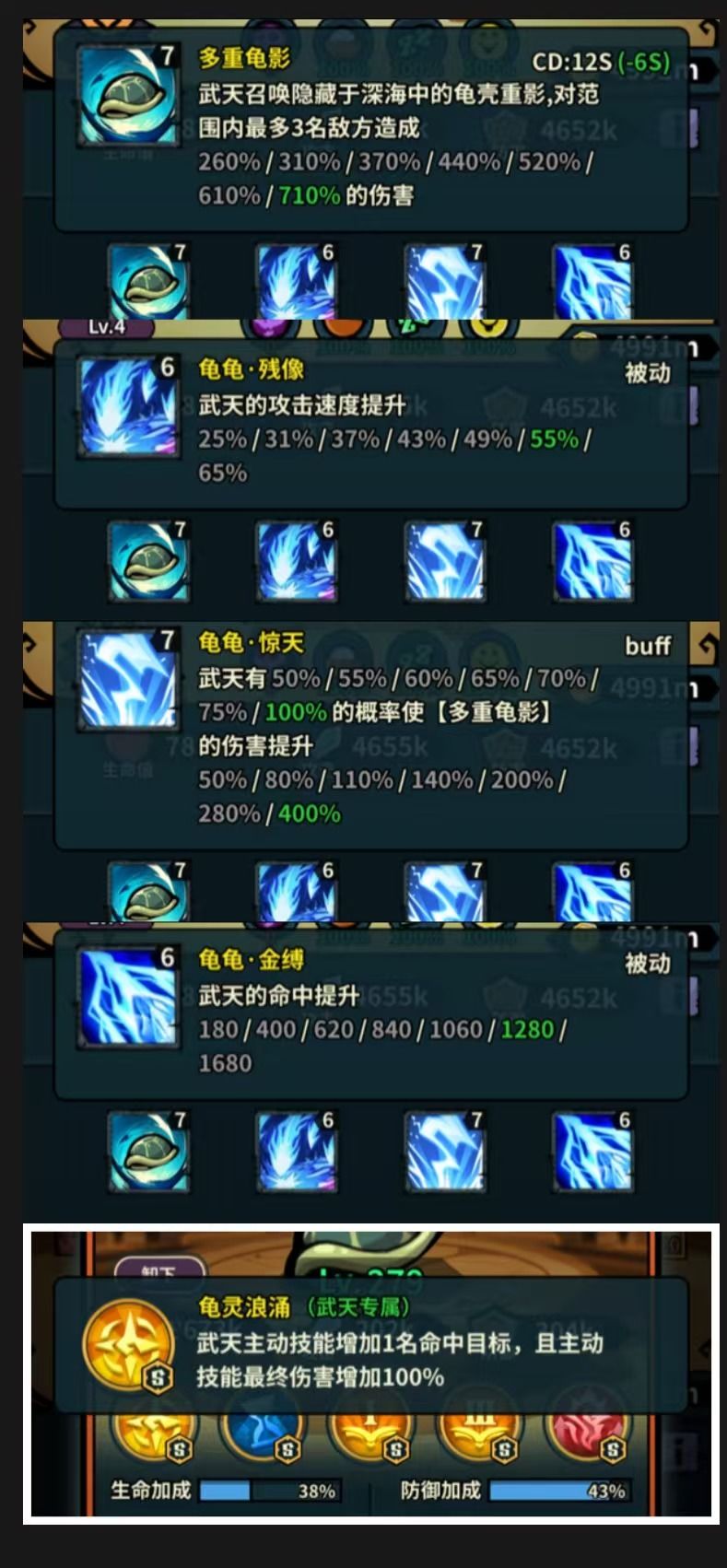 大家好我是275区的白泽V 今天给大伙带来一套龟龟主C的五法阵容 从275开服亲测到现在 一开始顶着同区各位同僚的劝说一路头铁到现在 证明我的想法是对的 好了废话少说 龟龟在大伙眼里估计都觉得是个废物 可我告诉你 龟龟废只局限于没专属神器前 一旦龟龟换上他的专属神器且一三技能拉满 那就是质的变化 (龟龟的专属神器可以在活动中获得 应该是开服的一两周这样吧 158左右就可以拿一个)龟龟神器必须要 武