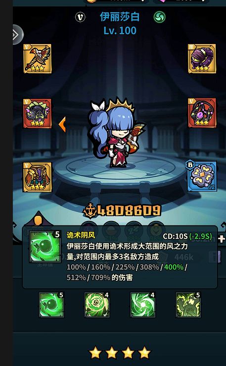 总结起来:伊利莎白就是风队的核心挂件,好多风属性的英雄都吃流血buff,伊利莎白挂上之后,风队伤害直接爆炸,是CD 随便弄一下都能减少30,轻轻松松的全程挂上buff,只要不死,风队就一直能吃到buff,不管是打巨龙还是打深渊,噩梦都是必不可少的英雄,而且平民玩家也能拥有,非常值得推荐