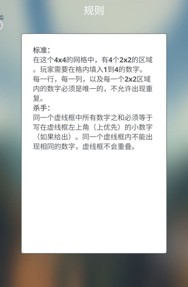 : 我刚好跟你相反😂😂我记得我玩的杀手数独规则里,是有规定同一虚线格中数字不相同的,可能咱俩玩的不是一个版本?可以推荐一下你玩的这版吗