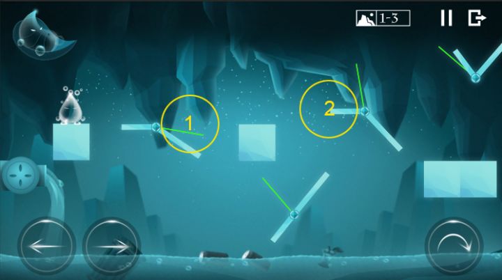 还是一个让玩家熟悉操作的关卡。这关会出现一些道具。开始闯关不久,玩家会看到一个类似闹钟的小图标,这个是暂停道具,它能让秒针停止运转。玩家要看需要拾取,像上图右方的秒针,让它暂停是没有意义的,反而会阻碍水珠人的前进。到达这里的时候,要小心圆圈位置的秒针情况,尤其是上方的秒针,由于它是顺时针运行的,如果水珠人过早的跳上去,可能会被秒针往左边推而掉下水。继续往前走,会看到一个小太阳的图标,这