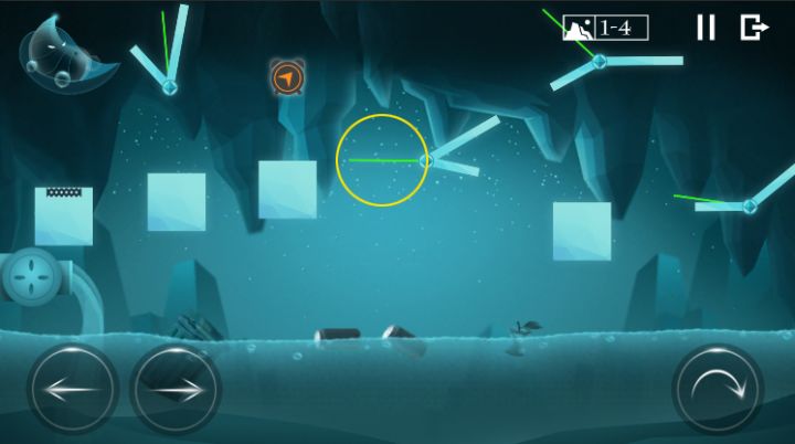 等位置1和2的秒针搭完桥后,水珠人迅速通过即可,位置3的方块会上下移动,移到最下面,会被污水淹没。如果水珠人不小心跳上去,而方块又是往下移的话,快到水位的时候,水珠人要跳起来,当水珠人再次落下,方块就会往上移动拖住水珠人了,这样能避免水珠人挂掉。又到选择路线的时候,这里最优路线还是在上面,即位置1所在的路线,因为碎片就放置在这条路线上,当位置2的秒针运行到如上图的位置时,水珠人跳上秒针,再次