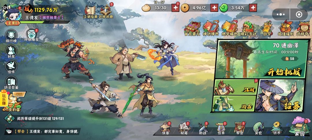 70-2之卡了很久了,之前到4分多钟就撑不住了。很久没打,今天想试试,真给我打过了。 阵容如图所示,没有一击,靠硬实力过的。当然有一点技巧, 核心出装:南宫婉,掌命,气绝 这关难在小兵太强,四分钟开始只剩南宫婉和掌命,其他武侠已经下班,不用浪费复活机会给他们,当很多飞机怪出场,要切换1倍速。4分多钟会有一次大波怪,一定要留气绝,把怪清掉。不要想死了再复活击退怪群,剩下两个武侠基本上这波秒去世,来不