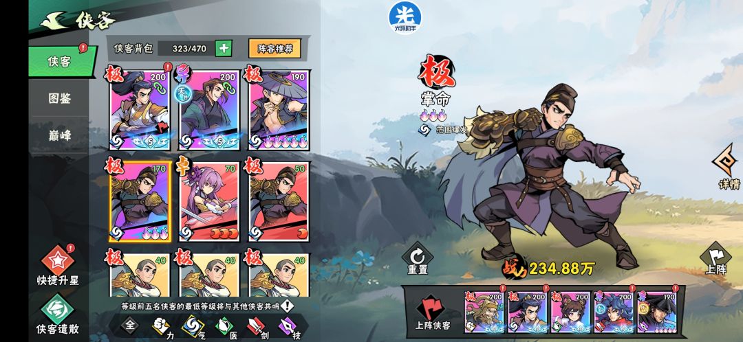 #江湖攻略 1,侠客阵容推荐,可以先刷首抽出了再玩,再氪双月卡。 零氪微氪: 医系作为主力,圆觉或竹叶姬,抽到那个多用那个。欧皇竹叶姬多可以用很久。 力系前期可以先用鸠智星,有极能上8星就用极,(在各系出战主力能到10星后,留3个卓五星的,重置主力,升星卓,开完图鉴拿战力提升,之后卓就全是作为狗粮了)重置免费。 后期极推荐空空,被动技能减伤稳定。 其他3系作为挂件,选穿透和分裂,能在冠绝一战打到