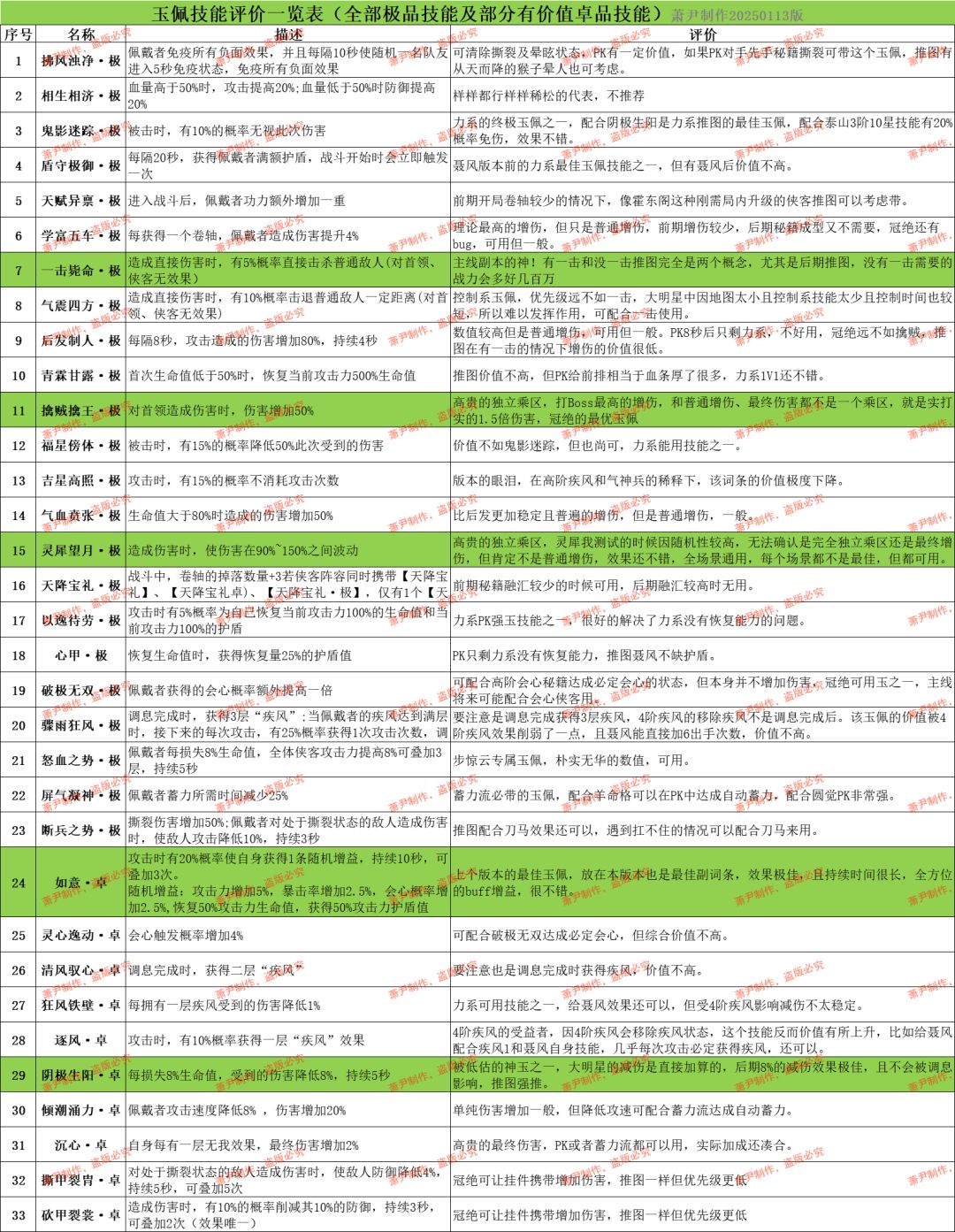 玉佩技能评价一览表