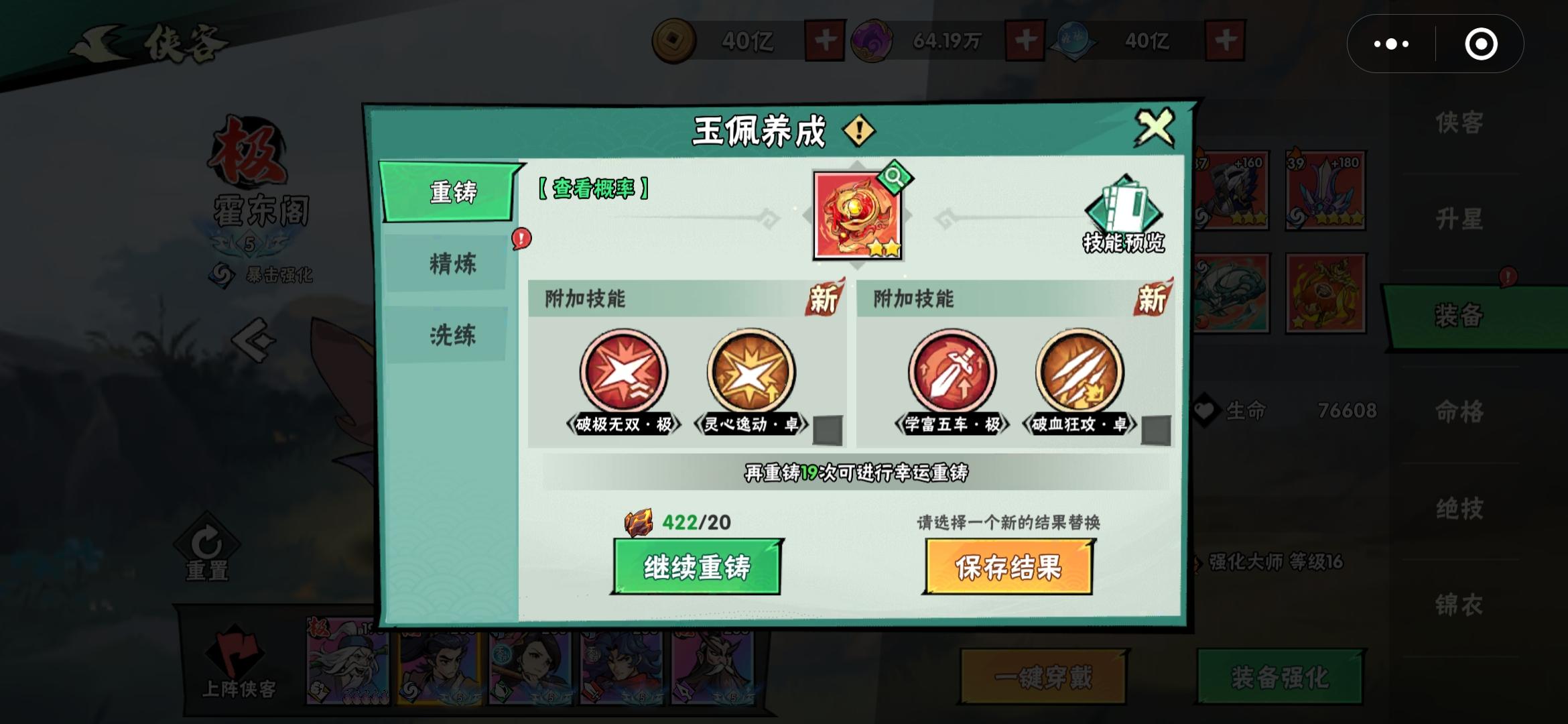 【现已不推荐该方法,玉佩洗练重铸请直接查看玉佩后篇,此贴不删纯粹为了给自己留个纪念】 按照新号发展历程叙述: 一、第一次玉佩活动 你得有一个红玉,没有红玉怎么办看玉佩前篇。首先重铸20次(刚好400个一轮,还能吃到重铸保底),如果中途出现红色技能:技能好,就刷出3攻击词条;技能不好也可以继续重铸到20次。总之你要完成一轮,不要超过400块,不要浪费。红玉不管好坏都给主c用 此时第一次玉佩活动结束 二