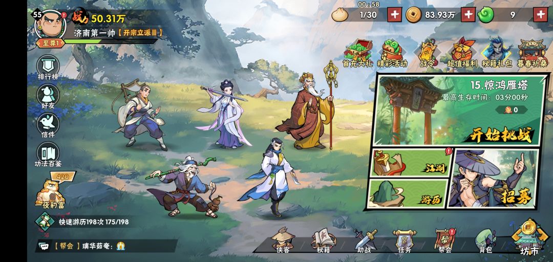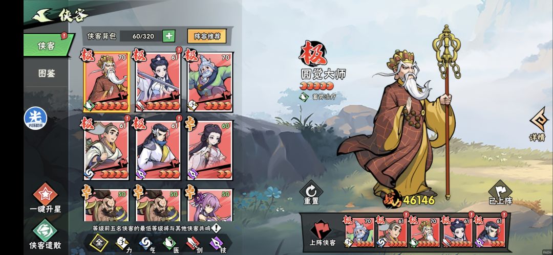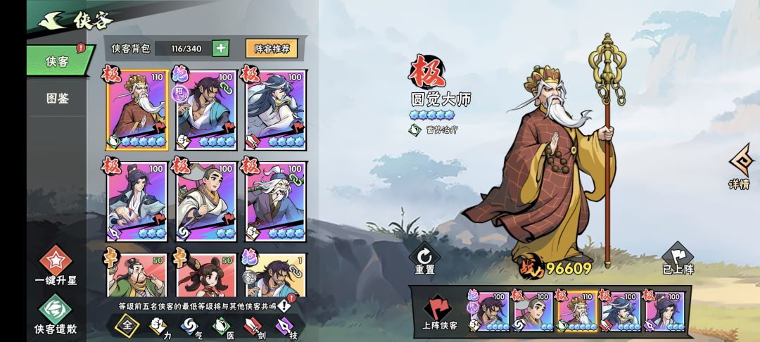 #江湖攻略 1,侠客阵容推荐,可以先刷首抽出了再玩,再氪双月卡。 零氪微氪: 医系作为主力,圆觉或竹叶姬,抽到那个多用那个。欧皇竹叶姬多可以用很久。 力系前期可以先用鸠智星,有极能上8星就用极,(在各系出战主力能到10星后,留3个卓五星的,重置主力,升星卓,开完图鉴拿战力提升,之后卓就全是作为狗粮了)重置免费。 后期极推荐空空,被动技能减伤稳定。 其他3系作为挂件,选穿透和分裂,能在冠绝一战打到