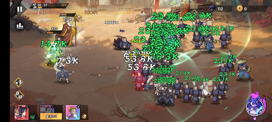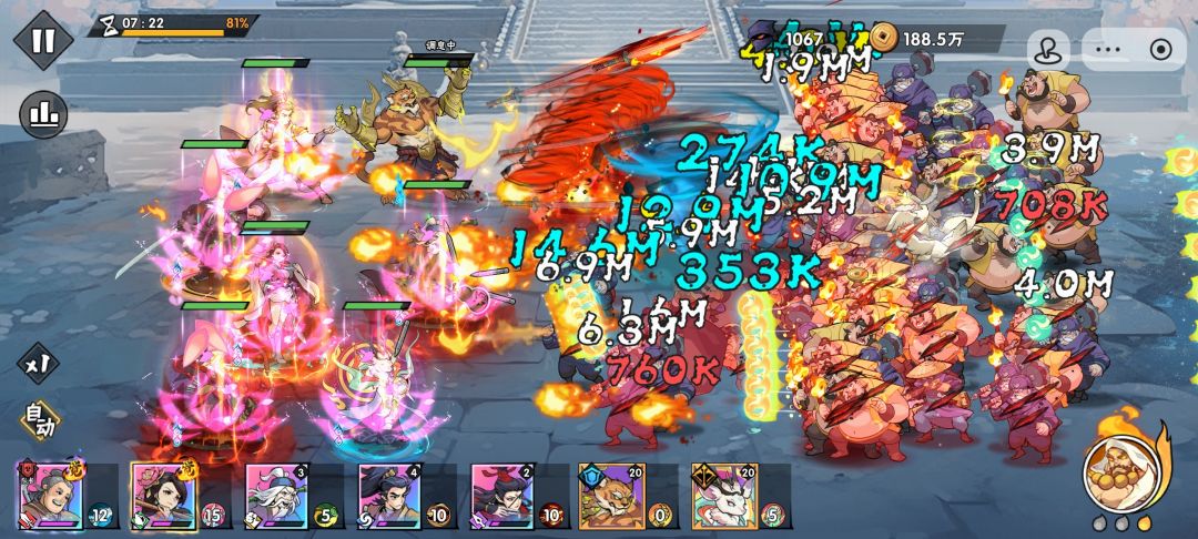 之前研究了很多攻略,都说这关要150万+攻击力才能过,对于我这个只有110万攻击力的号,岂不是要卡2个月😂。 办法总是比困难多,经过2天的测试,发现"一击"对于琵琶女还是能生效,只是需要的时间更久。那就增加坦度呗,尽可能的增加输出时间。 过关方法: 1分钟的琵琶女放聂媚娘(4个出现就放,可以清掉) 2分20秒琵琶女,放张道陵(5级技能,可以清掉) 5分多琵琶女,已经有了前五个秘籍,可以硬抗很久,