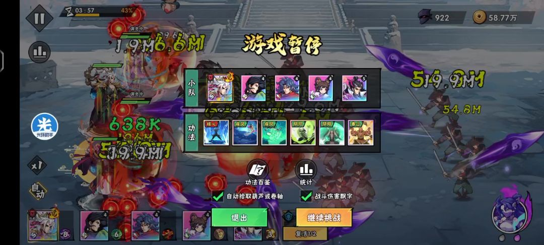 之前研究了很多攻略,都说这关要150万+攻击力才能过,对于我这个只有110万攻击力的号,岂不是要卡2个月😂。 办法总是比困难多,经过2天的测试,发现"一击"对于琵琶女还是能生效,只是需要的时间更久。那就增加坦度呗,尽可能的增加输出时间。 过关方法: 1分钟的琵琶女放聂媚娘(4个出现就放,可以清掉) 2分20秒琵琶女,放张道陵(5级技能,可以清掉) 5分多琵琶女,已经有了前五个秘籍,可以硬抗很久,