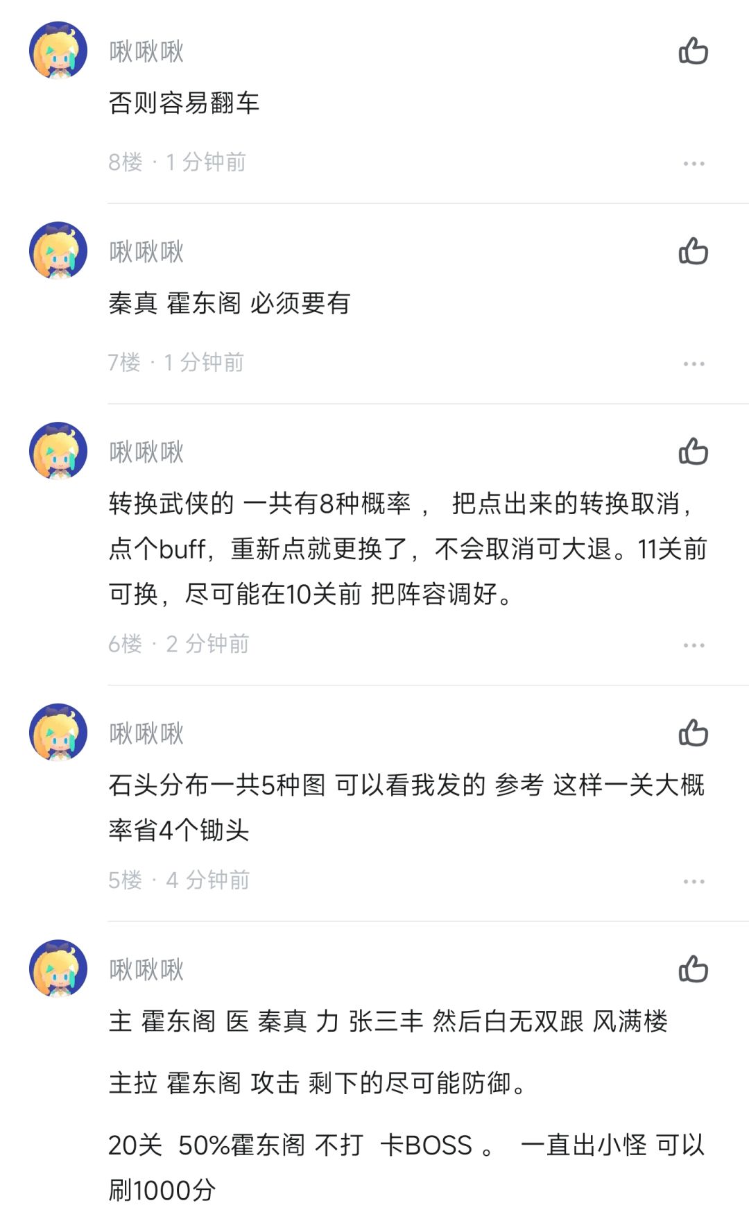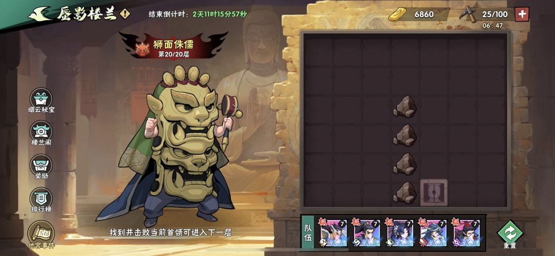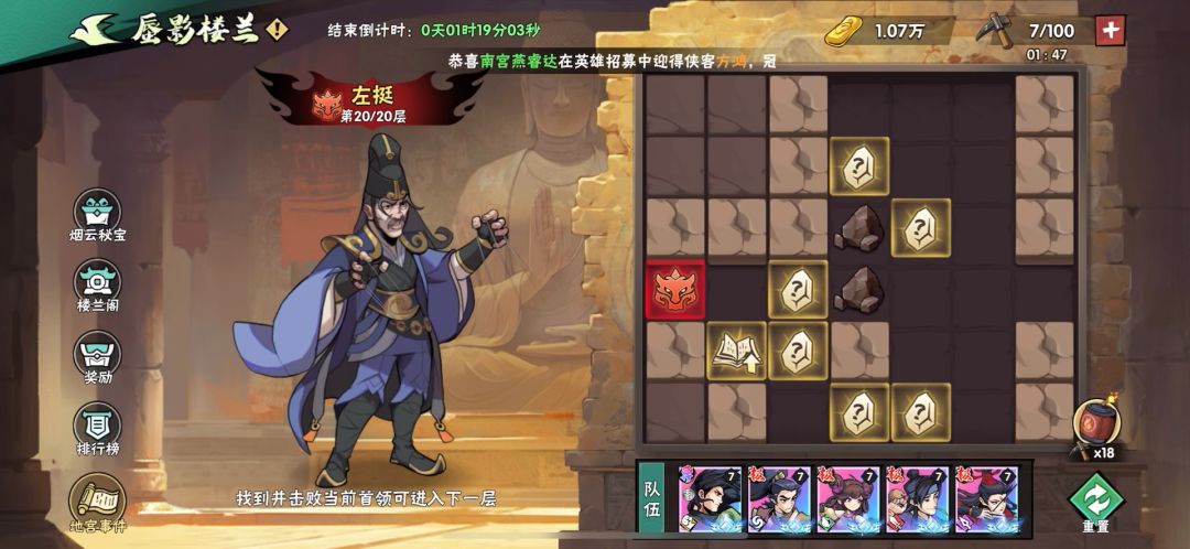本人经历两次英雄令招募各4轮,全部0个掌命,已经弃游了,将自己研究的楼兰攻略分享给大家,没有一个人愿意分享,那我来断他们代打楼兰的财路! 1.最重要的一点,用好刷新,方法为选到没用的赐福或秘籍,不要选择,直接右上角清理后台重进,3秒后重进楼兰会刷新选择内容,一直刷,直到刷到好的。 2.阵容组成:霍东阁+任意技(最好老王)+任意医(最好秦真攻速快能补伤害)+任意拳+任意剑(最好追雪),除了霍东阁,其