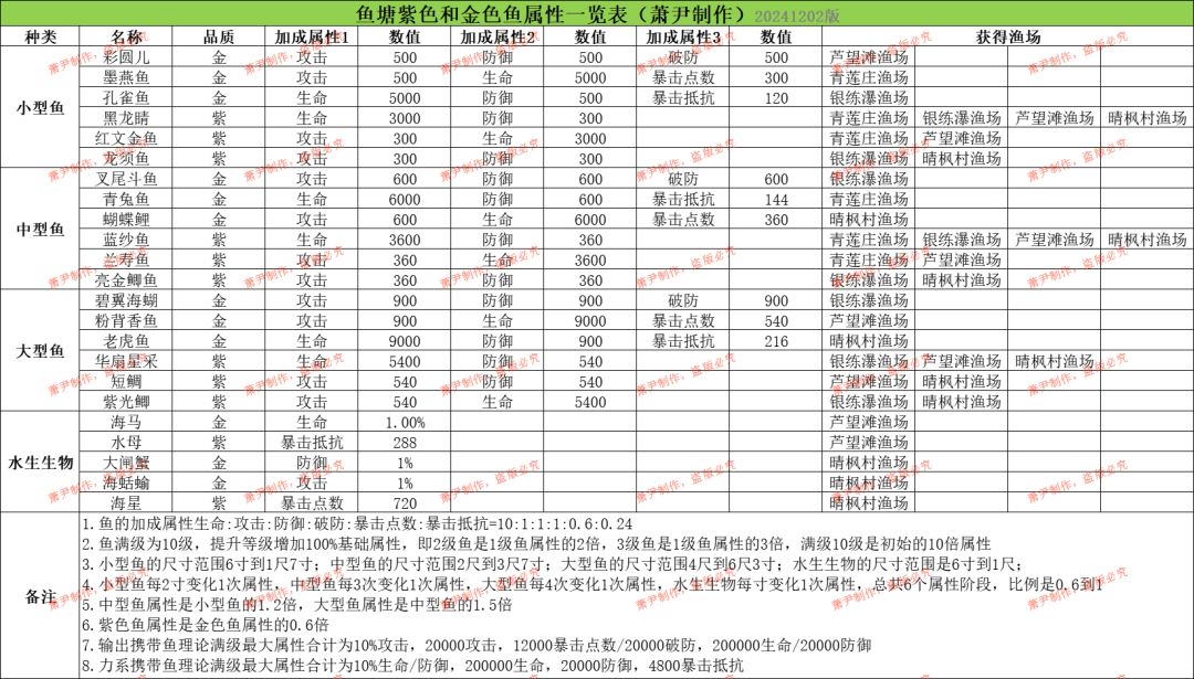 渔场的鱼属性加成一览表