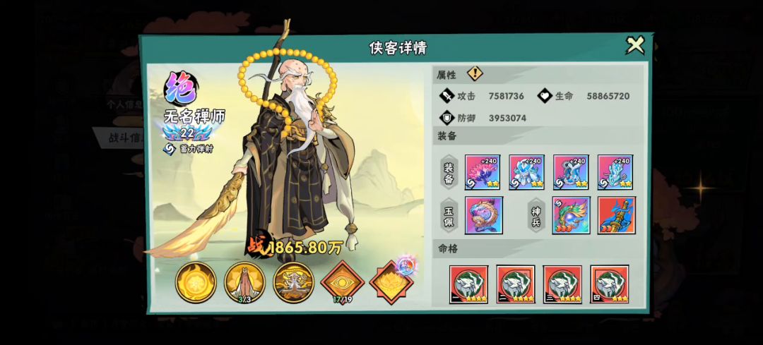 图二为冠决功法,因为我没有飞花打雨剑,这是我觉得伤害最高的一套,推图也是这一套。同战力圆觉阵容如果有更高的伤害搭配请说出来借鉴一下。 熬了几天,昨晚空空上了四太阳,早上领了复活丹终于过了17-5。很难。好在四太阳后不会在第一波第二波怪潮倒牌了。每次都可以尝试到最后。 有个小技巧,我的挂件是玄龄,就是放空空后面那个位置,带猴套。在75到80多进度的怪潮,空空被打死的情况下不要立马复活,还有很多屎壳郎