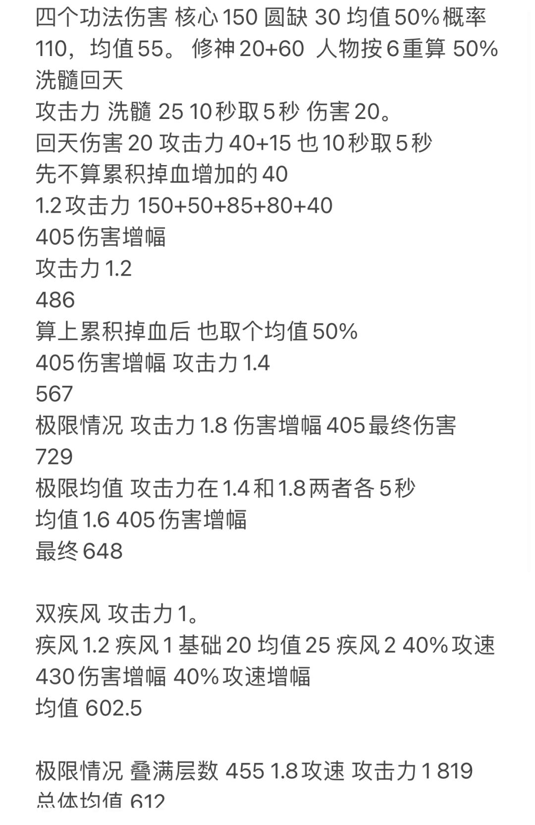 以6重剑系和气系侠客为主c的5功法搭配 都按1级三阶功法算 核心 圆缺 修神 固定,洗髓回天与双疾风对比 防御与破防不记入。攻击力与怪物防御的具体计算公式不知。 第一种是伤害=攻击力-防御力 第二种是伤害=攻击力*(1-减伤系数) 都把后面的看作1不去管。基础攻速也为1。 具体在图片。 总结,如果没有攻击次数限制,调息不重置,双疾风的增幅确实是最高的819。但是这游戏的攻击次数很少,并且调息还要重