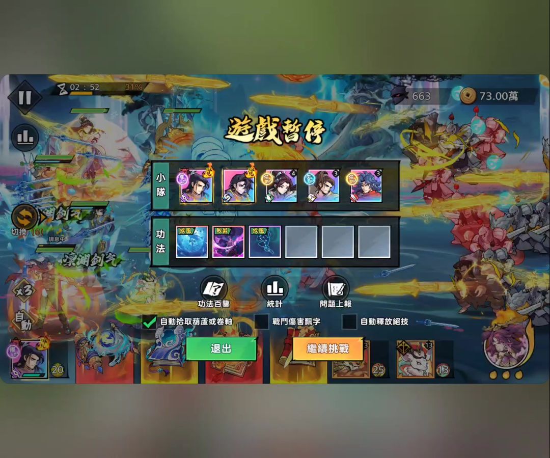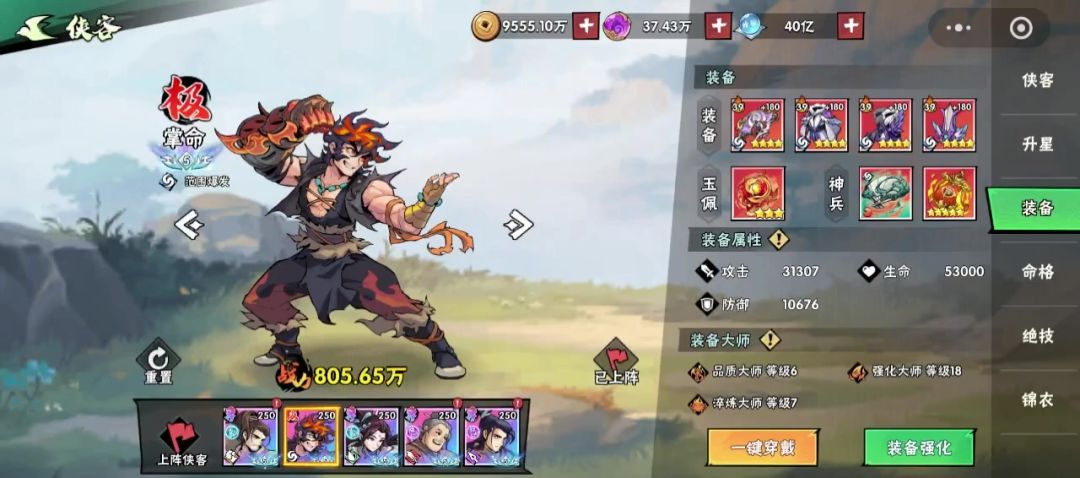 6200万战力,这关小兵没难度。本山带一击,双c换上全输出装。 韩立:544万,擒贼+猪命格 霍东阁:489万,虎命格(可惜只有一个擒贼[表情_汗]) 功法也是全输出,唯一需要注意的是6分40秒有波反弹怪,需要放慢速度放绝技,否则由于攻击太高会被自己弹死。 视频最后附侠客属性