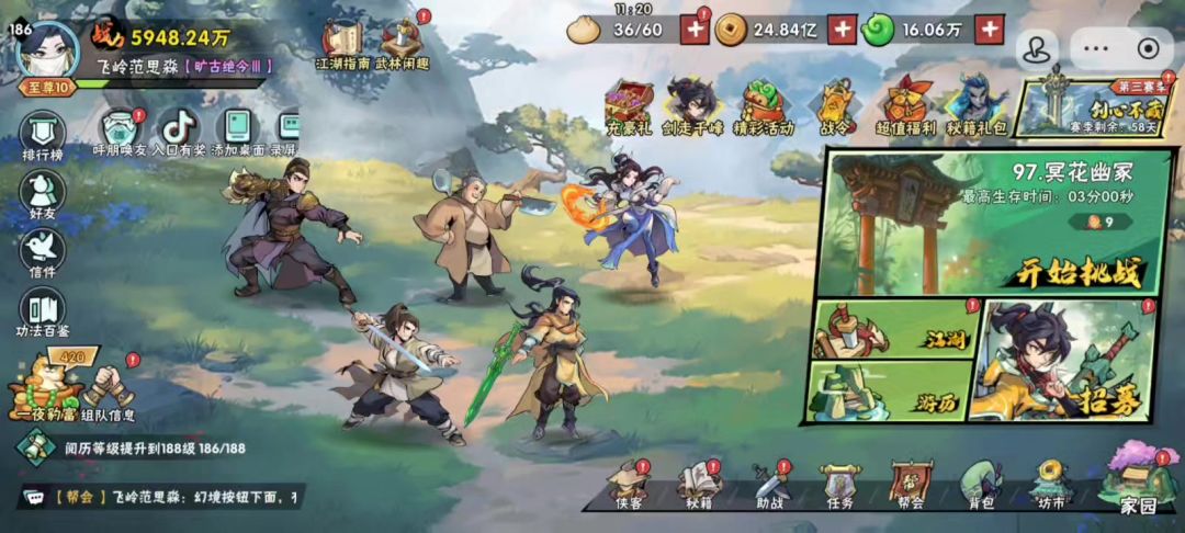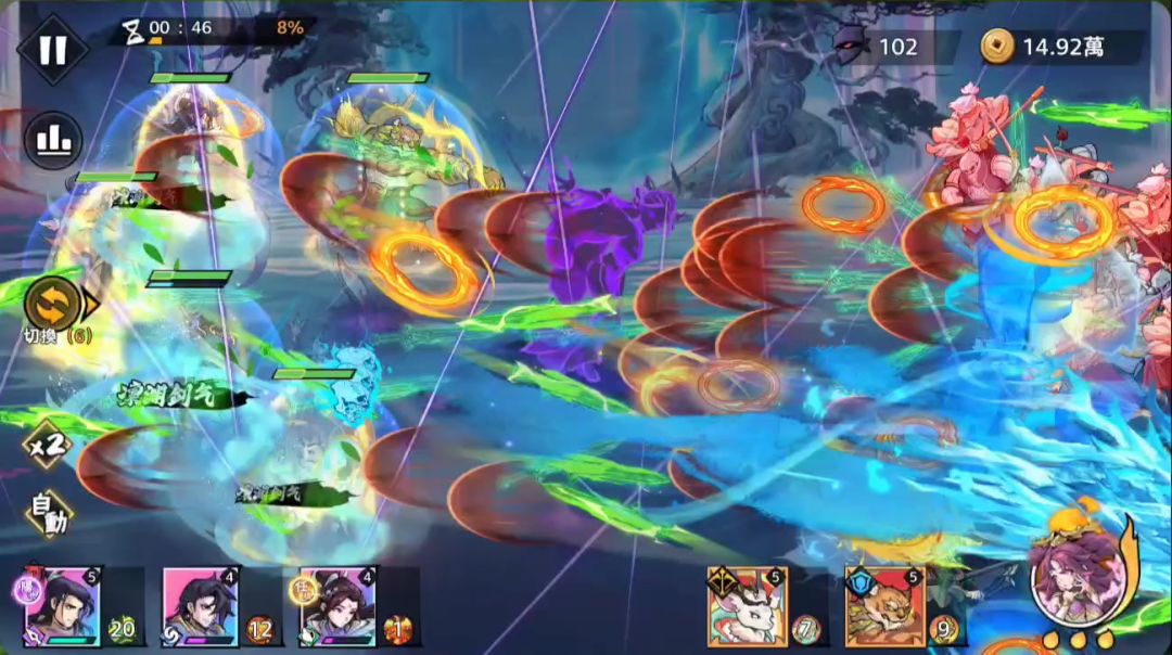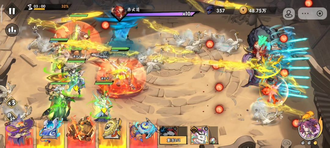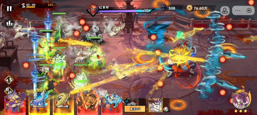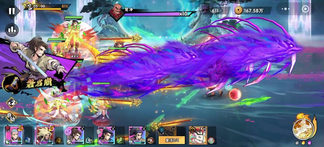 这关过的艰难,耗了不少体力,也调整了不同打法,最后考虑到怪潮凶猛,不想浪费一个招式功法,就让带一击的掌命当主C,同时为了对抗BOSS,给韩立选了核心。双疾风+败絮+圆缺必选,还剩下的一个首选修神,但是效果不佳,缩短的调息被疾风大大稀释,12%的终伤也不够看,反而尝试了撕裂,效果对boss肉眼可见。 功法来的很顺,第二个boss前就完全成型,于是摧枯拉朽,连武魂都没使用(正常情况至少用一个),后面的