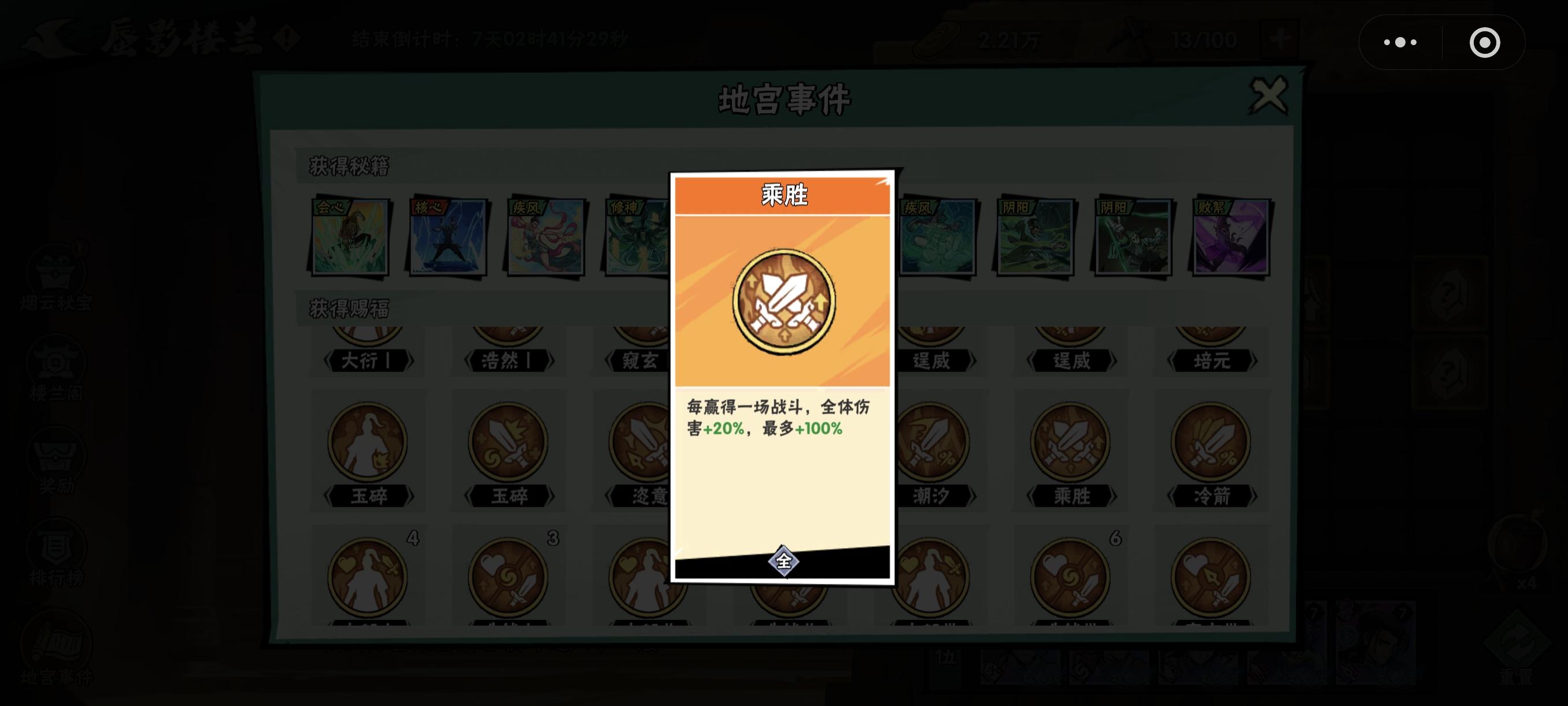 楼兰继承打法相对简单,主要就是拼速度,必须上好闹铃,5点活动一开立刻开打,打的时候开3倍速度,一般13分钟左右就8980满分,第一和第二只有几秒种的差距,最多一分钟。继承打法是继承上次楼兰活动前19层的状态,由于拼速度,拼稳定性,上次活动建议所有状态拿满,确保万无一失,秘籍建议不要拿潮汐,那个1%-250%太不稳定,很有可能会漏掉一个怪,你只要重打一次,第一就与你无缘了。继承时上来就是20层,你