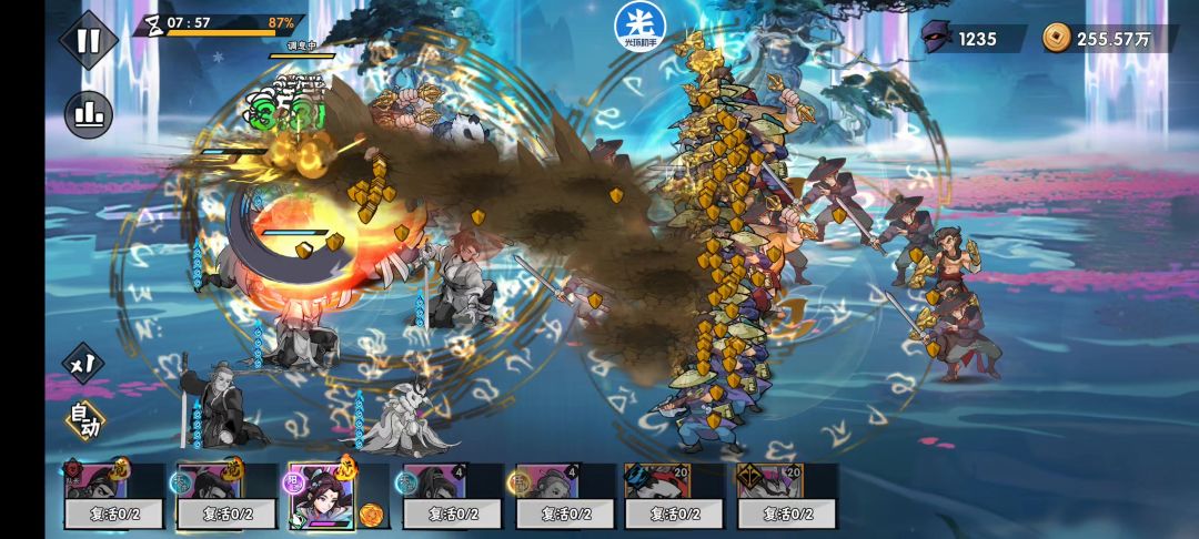 自从拿到韩立以后一击一直是给韩立戴的,掌命一直戴得红扶风,因为有眩晕怪的存在感觉这种戴法非常科学,再加上遇到卡关一卡都是一个多月,长时间不推图早把一击毙命的事忘到脑后去了。红光怪少的图韩立戴一击没毛病,85-3开始一堆的红光怪,韩立的剑都被吸收了问题就大了,更本清不掉怪。一击换给掌命小怪顺利通过,第一个boss血也太厚了,狂暴后就剩了医跟力,打了3分钟磨掉了boss一管血的20%,按这个速度算剩下
