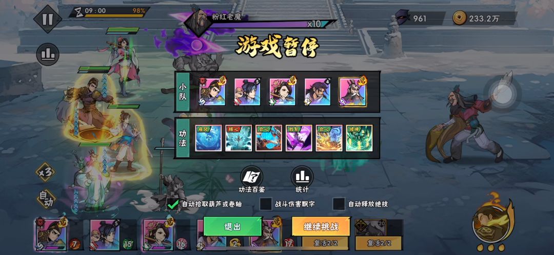 这关小怪狠,boss简单,把打boss的过程剪掉了,能过这关全靠天地明灭,这次秘籍活动也提升了不少战力,3阶秘籍6星融汇,4阶秘籍差一点三星融汇,霍127万攻击