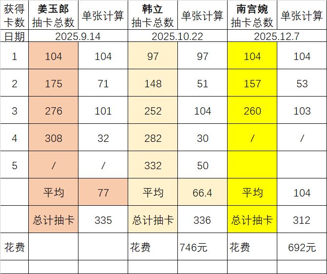 江玉郎 77抽一张韩立 66.4抽一张南宫婉 104抽一张马上至尊9了,停氪啦!月卡党走起,打发点时间!