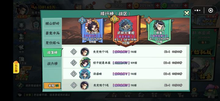 无一击700万推到70,1300万推到80,今天正式推图榜一,战区榜四。81以后boss的狂暴注定要靠数值慢慢堆。v1逆袭战区大部分v6v7的极限推图小技巧推荐给兄弟们。80大关之前直接上条件结论:白板南宫!!古宝别有乾坤技能,极限单C。南宫的坦度和奶量不用再多说了大家吹烂了别有乾坤的技能能让你拥有“两个南宫”!!从绑定的对象来说就走两套方案①绑定5号位力系②绑定3号位挂件80关之前有