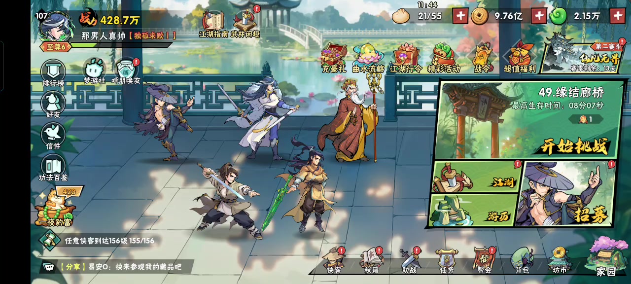 随机到了最废的锦绣+升龙,清兵超级慢还脆,杀怪全靠绝技。最后差点翻车了[表情_捂脸哭],好在还是过了。之前韩立和江玉郎组合,不用放武魂就过了。 说下配置,首先主c破防要到100%,没到的就升气神兵和技神兵到5星,都给主c带就行。其他反正看运气 视频最后附侠客属性和装备 另外,小程序组队有bug: 1. 捡卷轴后选择技能会无效 2. 然后还超级卡(建议: 战斗界面加个关特效的按钮) 3. 没有3倍