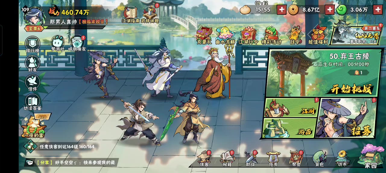 组队困难模式有点难度,基本上要找个4000万的大佬带能保过,问题是这个组队每人都需要票,哪有那么多大佬啊!券的储存上限只有12张,迫于无奈只好自己大号组小号了,一个2500一个2700。本着能打多少算多少,没想到居然通关了。过程惊心动魄!给我的心得是运气很重要,两个扫地僧,一个韩立,一个锦绣,5脉上官海棠,升龙,白板姜玉郎。功法选择是,初期气系侠客没确定时不要选择疾风,因为一旦拿到扫地神僧,疾风一