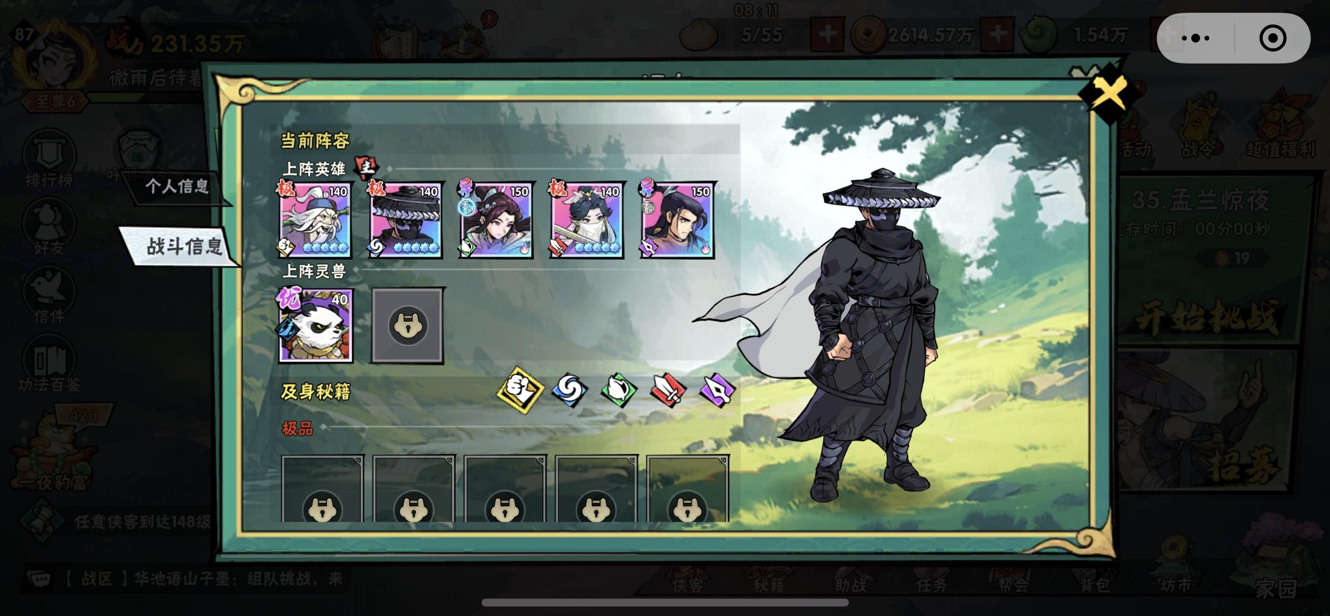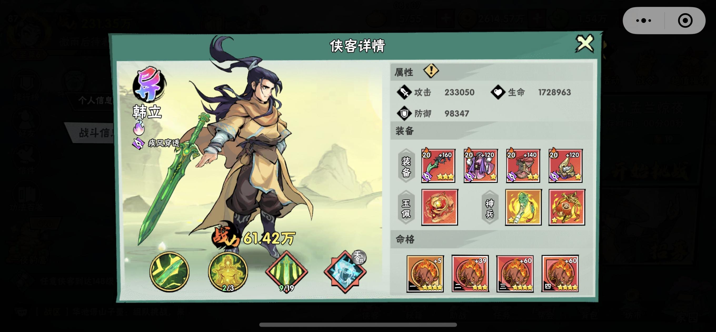 平民配置,一个8星融汇,没霸刀,没极武魂,功法等级低,没想到过关的曙光居然是”天降宝礼(极)”。之前由于只有一个八星融汇,功法差好远。昨天玉佩洗出了断兵+宝礼,换上后效果极佳,目测3分钟前至少多拿了2个功法。成功在boss1前拿到了2个四阶功法,最后说下侠客配置(也可见视频最后) 韩立: 455万攻击,一击,牛命格(如果有机会带猪命格还能多打两管血) 掌命: 430万攻击,擒贼,蚯蚓命格 南宫: