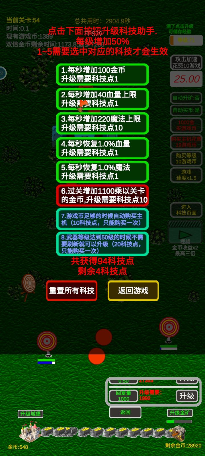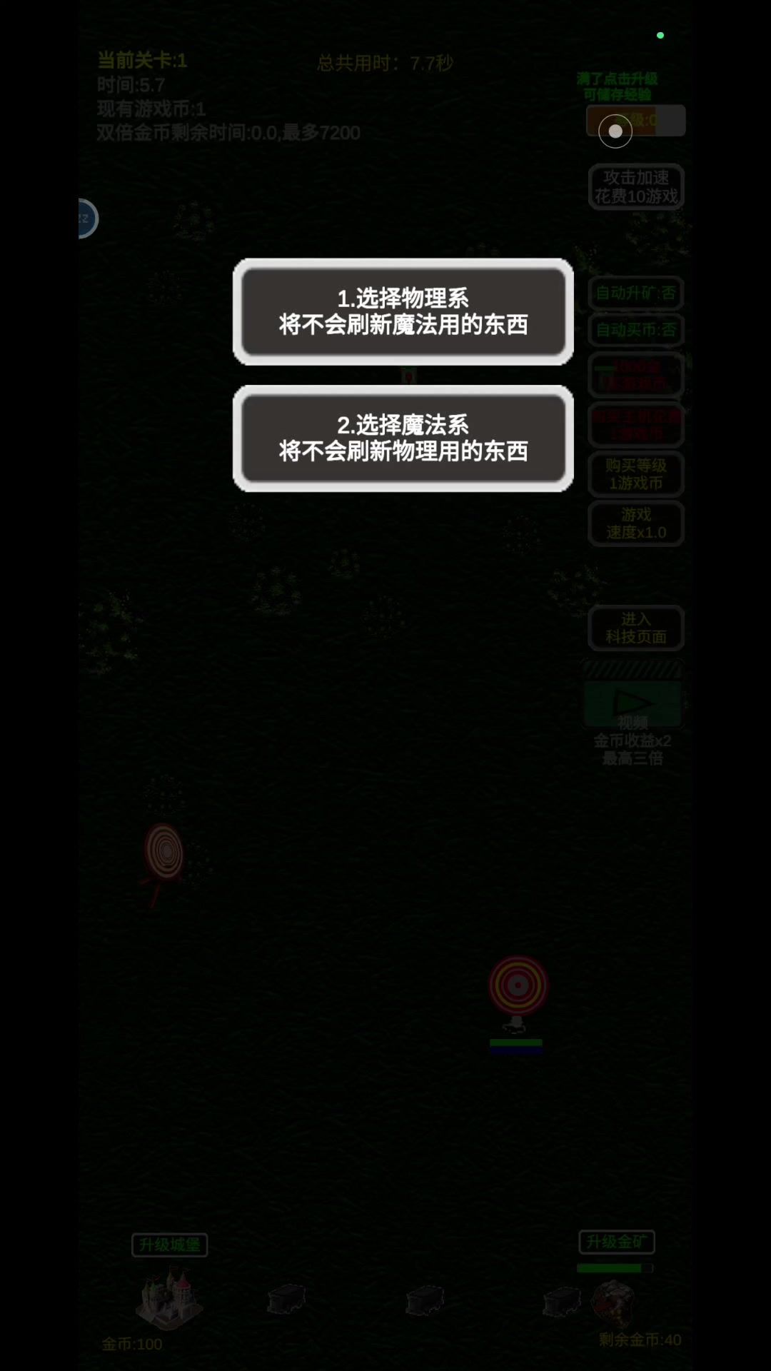 刚玩建议:物理用飞刀(10级能追boss,高级能穿透)血量10级,魔法用火球(10级能追boss,有持续伤害)魔力10级。先选金币科技助手。开始尽量拖长过关时间。打死第一个boss获得1科技点。可以尝试继续往后面打,也可以送死重开(科技点会保留)。科技点升级每秒金币科技。第二个boss会出2科技点,以此类推。