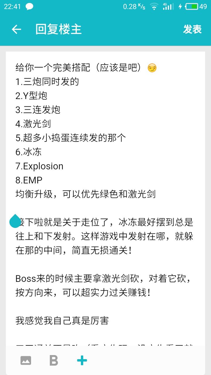 首先三大武器单一炸弹💣(站撸30级)不过太无聊了单一满级火简直无敌 不过打后期boss不能不动冰冻满级 反正是杀不了人伤害一万的激光。。。。未完待续。。。。可以吸的武器 不过还是没伤害的 8个一起比较漂亮这个眼熟诶 叫什么来着跟踪子弹 低级武器在升都没伤害 打小boss太慢了别摸我武器 完全是废 间隔时间太长了..........