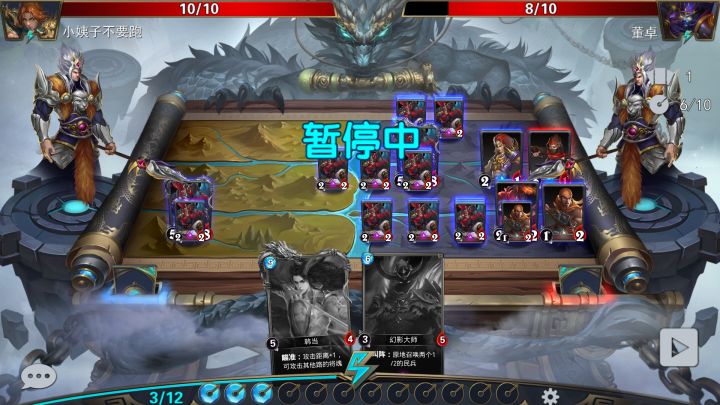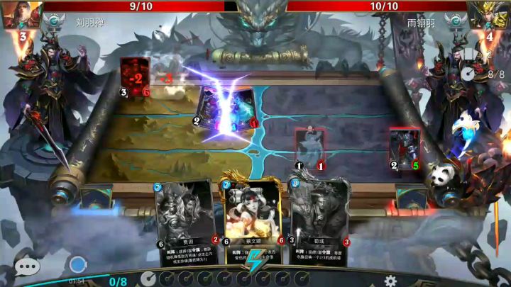 熟悉战斗界面:解释说明:『起手双方拥有三张卡牌,彩色牌为你够精魄出的牌,精魄精度条满时会刷新精魄并且精魄上限+1,你可以在任何时候将你手中的彩色卡牌拖入三路来出牌,手牌上限7张。『出牌后卡牌会向前移动并攻击范围内的目标,携带技能的卡牌会同时触发相应的技能。『精魄刷新时会从你的牌库中放入一张牌到你的手牌直至底牌为0。『己卡牌到达终点后,下次攻击可对敌方造成自己相应攻击力的血量,血量为0时输