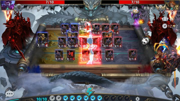 熟悉战斗界面:解释说明:『起手双方拥有三张卡牌,彩色牌为你够精魄出的牌,精魄精度条满时会刷新精魄并且精魄上限+1,你可以在任何时候将你手中的彩色卡牌拖入三路来出牌,手牌上限7张。『出牌后卡牌会向前移动并攻击范围内的目标,携带技能的卡牌会同时触发相应的技能。『精魄刷新时会从你的牌库中放入一张牌到你的手牌直至底牌为0。『己卡牌到达终点后,下次攻击可对敌方造成自己相应攻击力的血量,血量为0时输