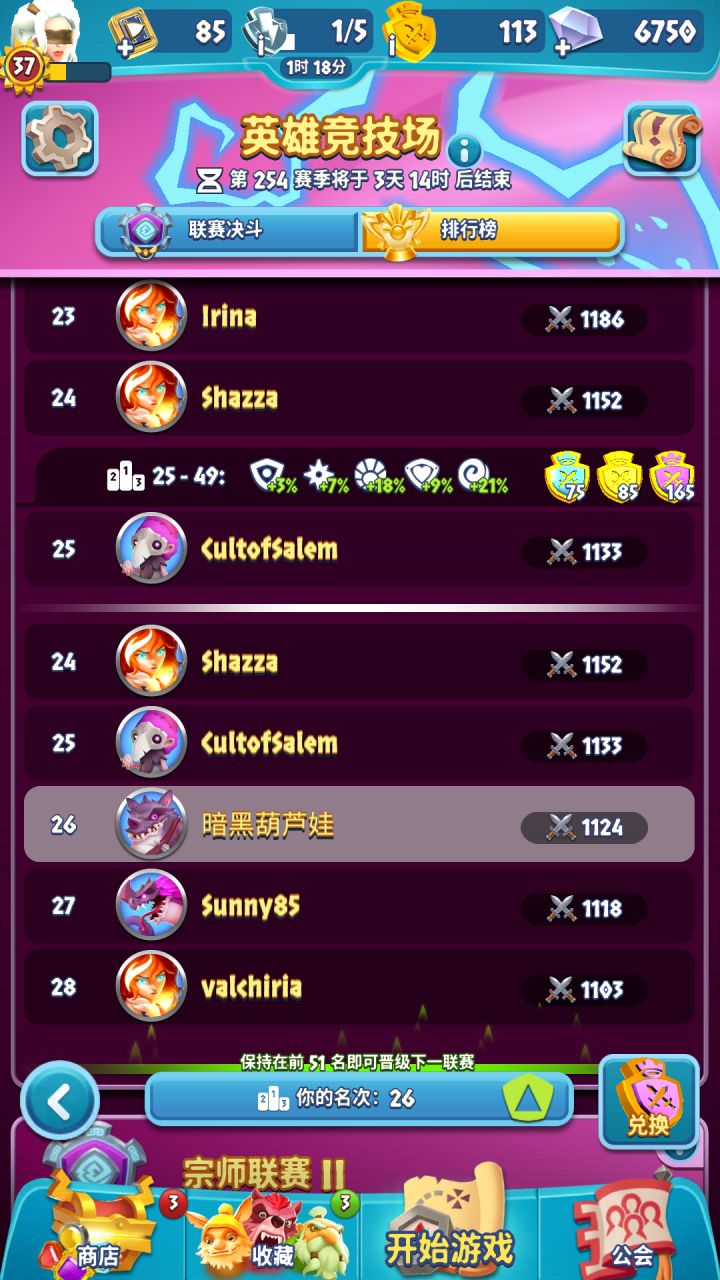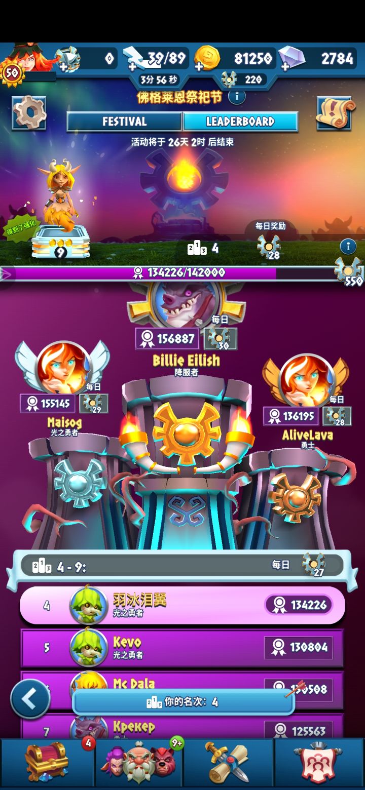 上次祭祀节送的提尔简直不是一般的强悍,有了提尔之后两万战力也能偶尔打赢四万战力的对手,上周只打到了六十多名,但愿这周能进前五十晋级到下一级联赛