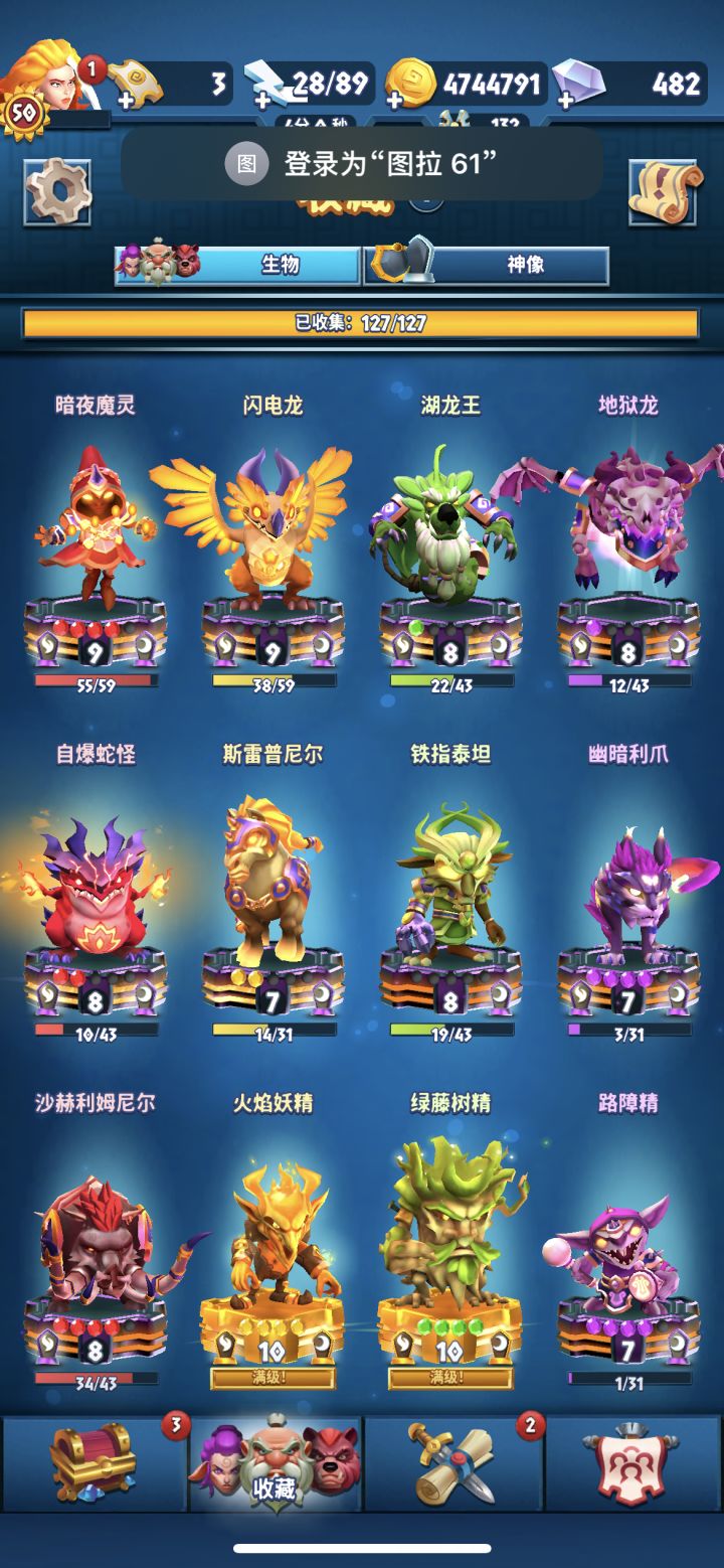 诈尸一人。两年前玩了仨月,刚回坑一个月。昨天才有第一只祭祀嫖的神话,但是冥国已经打到这里了。人生巅峰是密室24,四传奇没用钻石,脸白三连漏斗硬冲四关神话。哈哈哈可得叉会腰