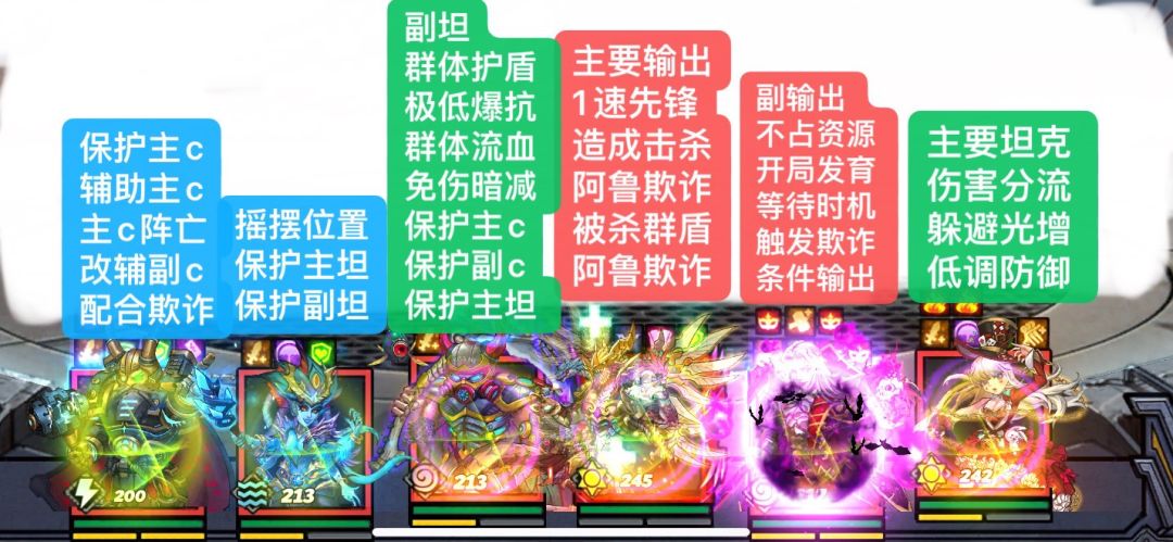 大家好,我是龙哥,这期分享给大家我的原创战术,也是我目前在用的战术,奇美拉阿鲁配,光暗混伤。死神爱丽丝光暗混防。全员互保,分散压力,增加容错。下边是占位以及职责图。(业余发帖,渐进更新,请谅解) 本阵容经过我上千场的测试,稳定强悍(中氪)。 【先手】 基本战术就是奇美拉先行出手,通过回合炮+一次普攻+一次大招(触发一次协战)四段攻击来沉默爱丽丝或者击杀后排脆皮。奇美拉连击率25%+雪王20%+科技