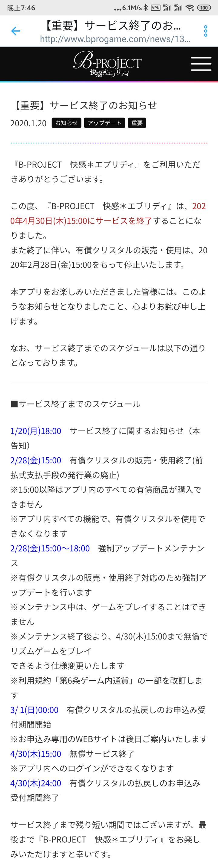 感谢您游玩『B-PROJECT 快感*エブリディ』。“B-PROJECT 快感*エブリディ”的服务将于2020年4月30日(星期四)15:00结束。随着运营结束,付费钻石的销售和使用将在2020年2月28日(星期五)的15:00停止。我们衷心的向所有喜欢此游戏的人致歉。以下是直到运营结束的时间安排表。——————————————————————■到运营结束为止的安排1/20(星期一)