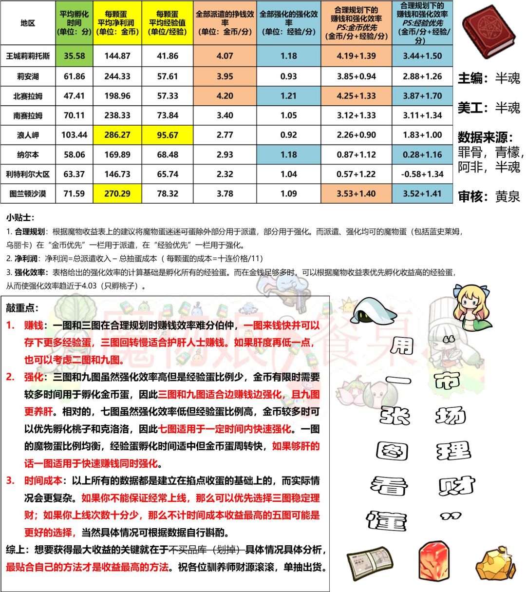 重点总结: 赚钱:一图和三图在合理规划时赚钱效率难分伯仲,一图来钱快并可以存下更多经验蛋,三图回转慢适合护肝人士赚钱。如果肝度再低一点,也可以考虑二图和九图。 强化:三图和九图虽然强化效率高但是经验蛋比例少,金币有限时需要较多时间用于孵化金币蛋,因此三图和九图适合边赚钱边强化,且九图更养肝。相对的,七图虽然强化效率低但经验蛋比例高,金币较多时可以优先孵化桃子和克洛洛,因此七图适用于一定时间内快速强