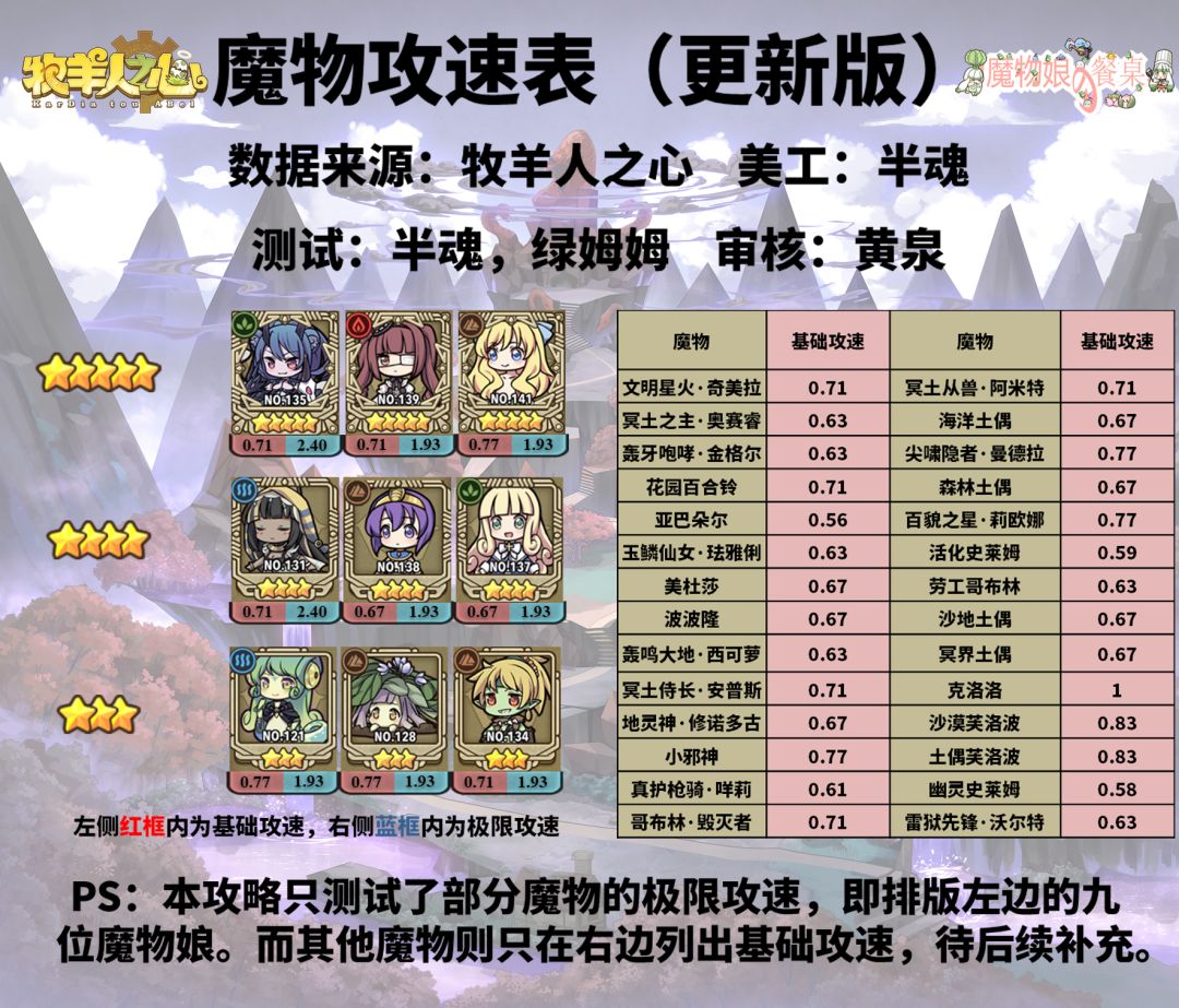 【本次更新的魔物】 棉花糖史莱姆 & 三星 & 四星: 陪跑,只有开三羁绊的价值。 【魔物信息】 蛋糕团长·奶油霜 ★★★★★ 奶油漩涡 AP:21 CD:28s 创造一个持续8秒的奶油漩涡,每秒对敌人造成25%/30%/35%总攻击力加成的伤害,并使友方单位获得55%/65%/75%总攻击力加成的治疗。 【被动】奶霜糊脸:1技能和普攻伤害有15%/20%/25%概率使敌人进入混乱状态2秒。 【强