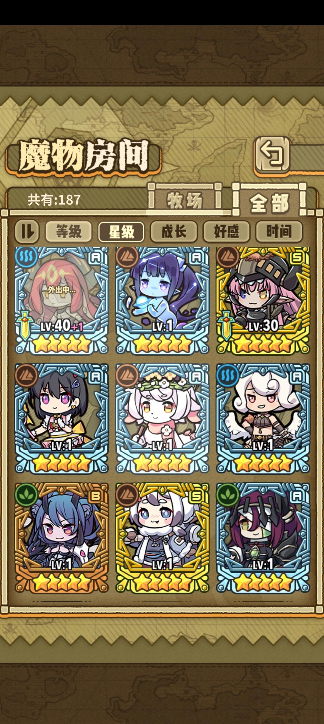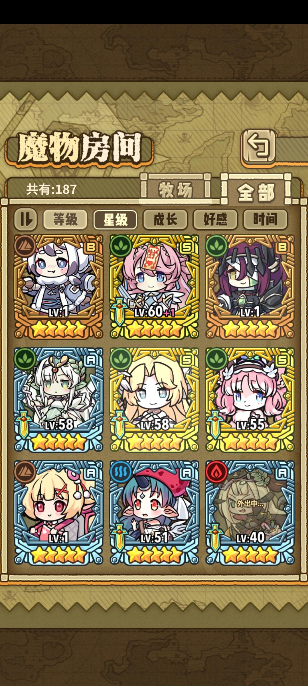 一、一堆五星,感觉都很拉跨,不想浪费资源。卫圣三破,白马二破,其他的全满破了,虽然还有6个彩蛋,22个白蛋,但常驻副本也不想浪费,等歪吧。二、升星任务全做完了,除了脆脆鲨,其他等级都在60左右,不打算吃经验蛋了,计划是坐等双倍布丁顺便刷等级吧。升星70之后打算做sp(也当是打发时间吧)三、常驻副本共8个,现在5个副本的资源都兑换完了,还剩3个……也懒得探索了……不知道现在该干什么,反正不管