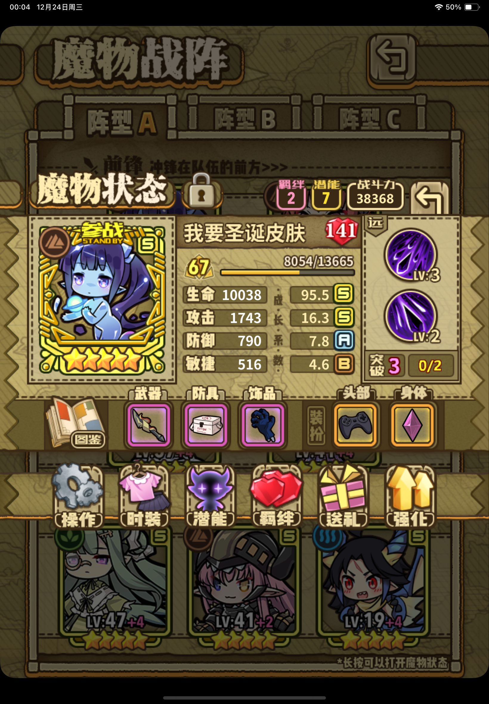 一、一堆五星,感觉都很拉跨,不想浪费资源。卫圣三破,白马二破,其他的全满破了,虽然还有6个彩蛋,22个白蛋,但常驻副本也不想浪费,等歪吧。二、升星任务全做完了,除了脆脆鲨,其他等级都在60左右,不打算吃经验蛋了,计划是坐等双倍布丁顺便刷等级吧。升星70之后打算做sp(也当是打发时间吧)三、常驻副本共8个,现在5个副本的资源都兑换完了,还剩3个……也懒得探索了……不知道现在该干什么,反正不管