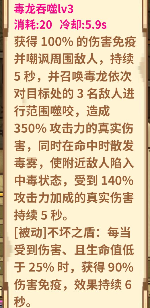 冷却5.9无敌持续5秒一直点毒龙就可以一直无敌!还要什么吸血一直堆冷却一直爽啊!