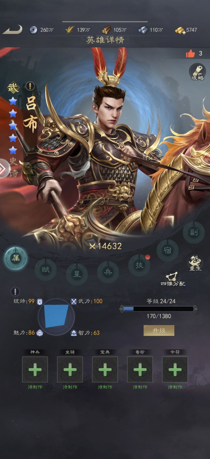 这款游戏属于国战游戏,很多经验会比较通用,此攻略基础是在QQ群联系客服领取五元代金券的基础上完成,属于一元攻略😂但零氪依然可以看,大佬的话仅供参考游戏开局平民开局有吕布,貂蝉,黄忠,首冲一元(找客服领取五元代金券)送赵云,和一个自选,这里选关羽凑齐赵云合击技能由于第一天只开放一个武将作为一个队伍,这里可以梭哈资源给吕布和赵云,先把等级拉满,技能选择优先伤害性技能,其中吕布策略兵种选破甲,赵云