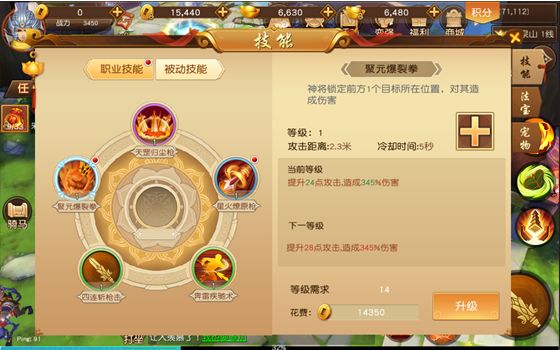 技能系统悟空传中针对不同的职业角色有不同的技能,同时还配有炫酷多彩的法宝技能,精准快速的连招,定能让你体验到极致的打击快感!1、技能介绍 打开变强界面,切换到技能标签页,可以查看到所有的技能信息,包括技能“数量”“图标”“等级”等; 主动技能界面 被动技能界面2、技能升级 玩家已经学会的技能,可点击技能界面中的“升级”按钮进行升级,升级后的技能将会拥有更强的伤害;可以在该界面右侧看到该技