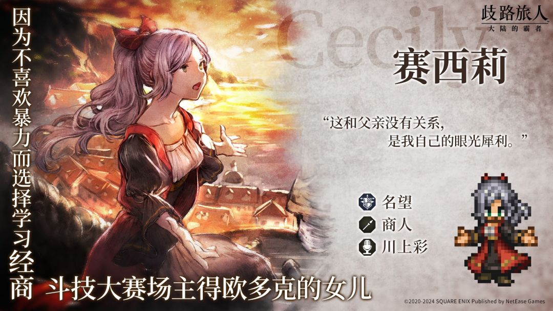 赛西莉基本信息 角色名称:赛西莉 职业:商人 突破弱点:枪、斧、书、光 影响力、名望 初始星级:五星 旅人评测 #歧路旅人大陆的霸者 #歧路旅人 #八方旅人 #游戏攻略