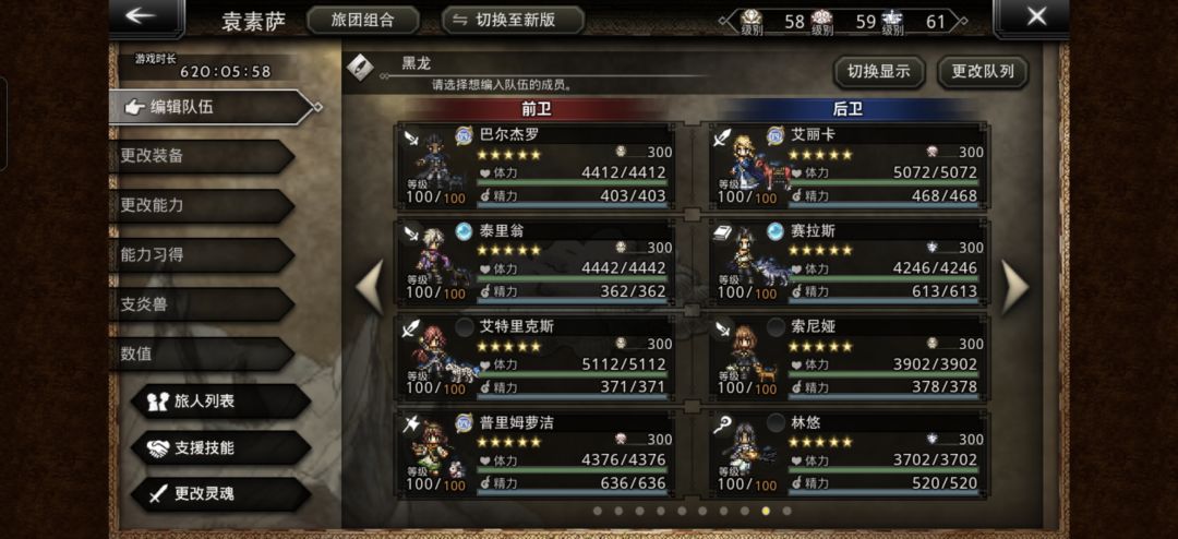 如同,目前为止打下了,斧,书,弓,枪,匕首。 还剩,扇子,拐杖,剑3把武器。 历战如何开启: 如图4 在你过完主线后,会接到一个任务,那个NPC会告诉你,历战强者会隐藏在人群中,前四个小镇历战是直接开启的,后四个是需要击败高级讨伐BOSS开启的。(讨伐BOSS比历战本身都难打) 图3是打斧头的队伍图,我以斧举例分析下历战怎么打。 一排前卫,负责破盾,可以破3,后卫枪洁输出 二排前卫,破盾薇欧拉,可