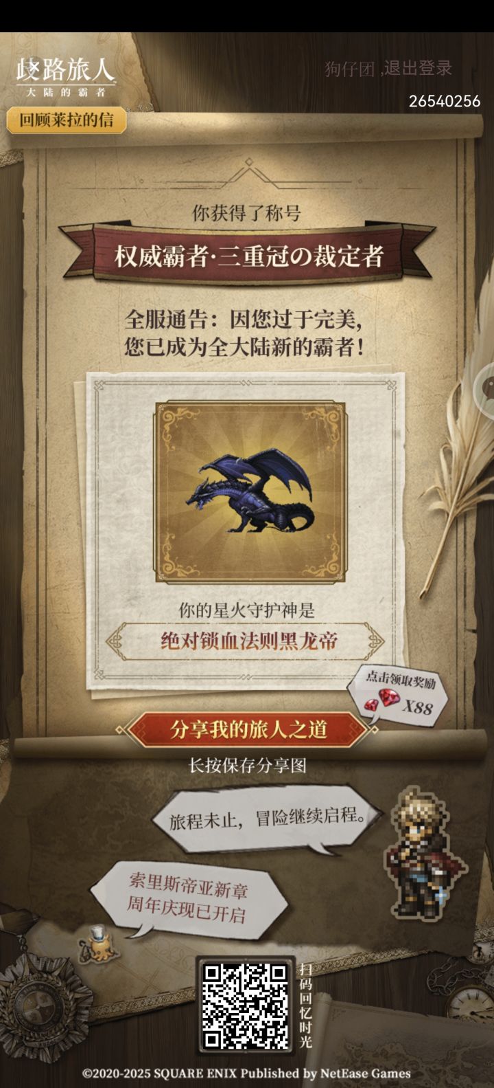 目前游玩1500h+(挂机刷材料时间较多),打boss基本上是抄作业,还剩18000红宝石,几乎开服全勤(350天)目前只氪了几次的札记和月卡,个人感觉大霸吸引我的地方就在于想玩就玩 没有那么多焦虑(反正几乎纯单机没有交互)可以每天只上线5分钟收个菜也可以在上面钻研一天怎么打塔打boss,今天运气还不错 40抽直接出了女帝,看到入坑的萌新比较多,有啥想问的可以直接问 看到了就回#歧路旅人大陆的霸者