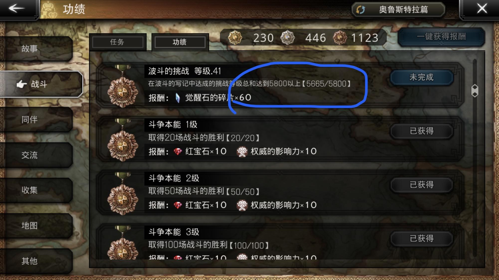 关于这个功绩里波斗等级的觉醒石碎片奖励,它是你打所有boss选择的难度等级,跟boss等级没关系,如图2你把难度算选了后它的等级是160,等级100即可拿boss页面全部5个奖励,出去后的图标如图4,显示全部达成,如果打全debuff下的boss,打过去后boss页面的图标会显示是完美如图3,截止明天更新前现在波斗是36个怪,如果全按100全部达成算功绩里的等级是3600,现在抛开9个额外等级的大