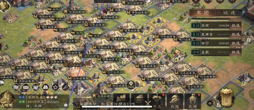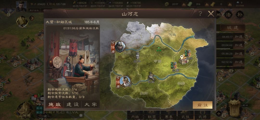 山河图 对于新手来说,山河图就是跟着游戏导引一通建设!!其实,那样你会损失很多东西! 这里我们说一下三种: 资源。游戏前期奇缺的是石头建设急需。 石头,设施要在沙漠建设才会有隐藏加成。 铁,设施要在雪地才有隐藏加成。 木头,设施要在森林才有隐藏加成。 粮食,设施要在沃土才有隐藏加成。 军备。游戏前期在这里可以得到大量免费兵员,疏忽就会错过。 募兵府,每季度多一个就可以多500兵(免费给的啊),